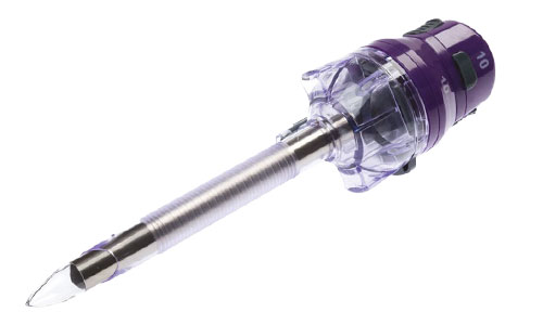 The Purple Surgical Elite AutoShield Trocar features an ultra-sharp, linear, bilateral blade for simple, minimal force insertion into the abdominal cavity.
