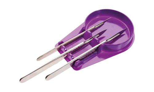 The Purple Surgical Scalpel Shield is a purpose-designed device for the safe, secure storage of up to three scalpels in the sterile field.